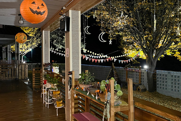 바깥 정원이 할로윈 느낌으로 꾸며져 있었어요.