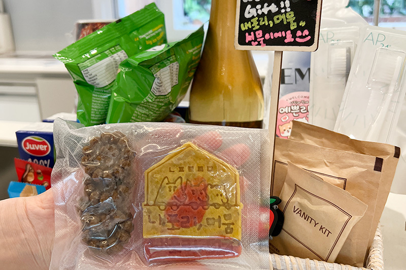 강아지 수제간식, 칫솔, 수건, 스파클링 와인, 컵라면, 뿐만 아니라 냉장고 여시면 음료수, 계란, 쌀떡까지 엄청나게 많이 챙겨주십니다!!